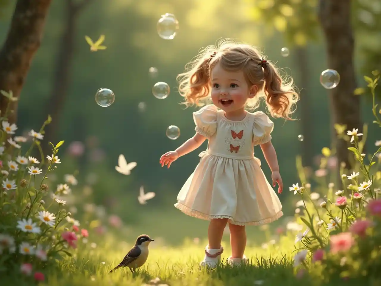 In cerca di bolle in un giardino da fiaba, una bambina bianca di 5 anni con le indossa un vestito ricamato di farfalla. Vigne luminose e passeri che cantano la incorniciano, i suoi risati irresistibili irradiano innocenza e fascino magico in un'ambientazione naturale incantata.