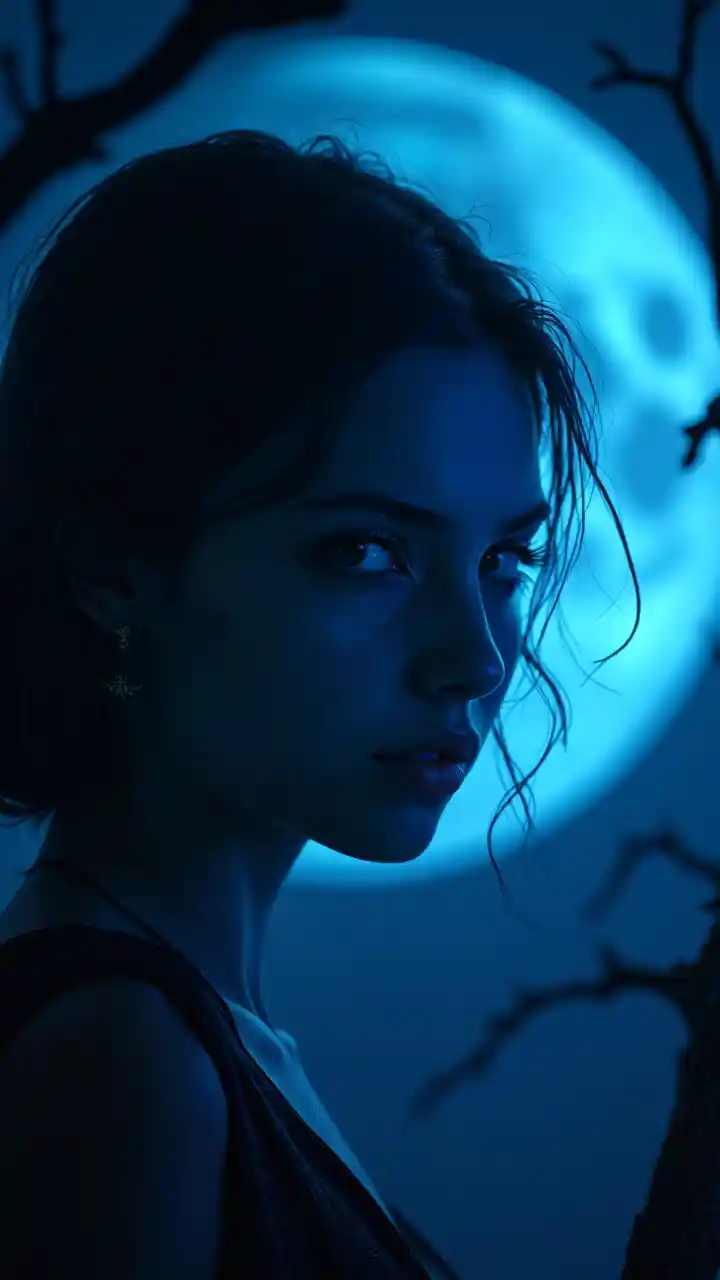 Colore eterico, fiabesco, blu di cobalto, colori luminosi, questa foto da vicino si concentra sul volto di una donna straordinariamente bella, il suo sguardo penetrante e silenzioso, sullo sfondo luminoso della luna piena. Anche se gli altri tratti sono oscurati, l'incrollabile intensità della sua espressione suggerisce una profondità di carattere e un senso di scopo che cattura lo spettatore. I rami contorti e nudi degli alberi che incorniciano la scena aggiungono un elemento di intrighi, suggerendo la possibilità di forze invisibili o di una narrazione più profonda che si sviluppi oltre i confini dell'immagine. Il netto contrasto tra gli occhi scuri e penetranti della ragazza e il bagliore eterico della luna crea un'atmosfera inquietante, quasi di un altro mondo, invitando lo spettatore a confrontarsi con i significati nascosti e il potenziale significato riflesso nel suo sguardo pensiero, inflessibile