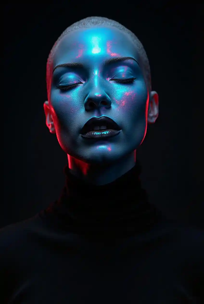 LunaPrimo piano di una silhouette iridescente senza volto, fantasia surreale e inquietante, modella con col nero, sfondo nero