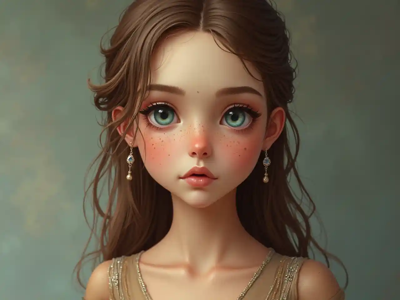 Una ragazza con i capelli castani e gli occhi azzurri. Indossa un abito costoso con orecchini e ha una pelle molto chiara. ha anche una talpa sotto l'occhio destro.