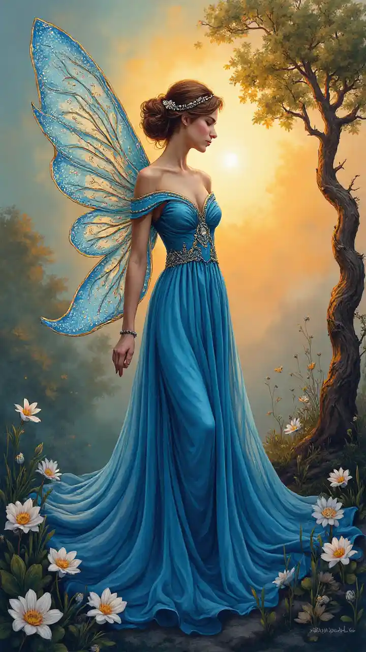 L'anima interiore di una bella donna Fata vista del corpo in un abito pittura a spazzola acquerello colore selettivo di olio alcolico blu e oro con un mosaico sottile sulle ali fiore con alberi colori di tramonto