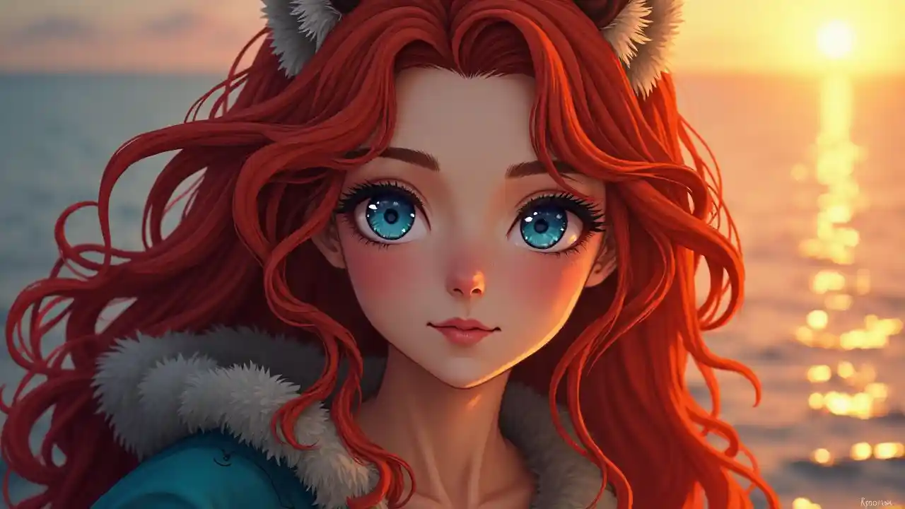 OliviaBella fantasia Bella ragazza Occhi blu Capelli rossi , Giungla , Lupo , Mare al tramonto