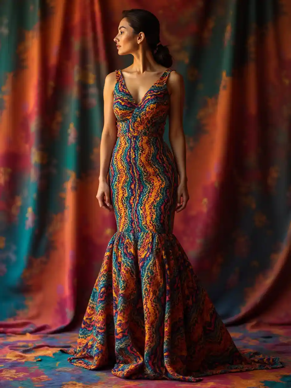 (vibrante Missoni vestito), disegni colorati, silhouette elegante, tessuto fluente, texture lussuose, fotografia di moda, strisce e zigzag, colori ad alto contrasto, sofisticato e chic, impostato su uno sfondo elegante, luce ambiente calda, ultra dettagliato, qualità 4K.