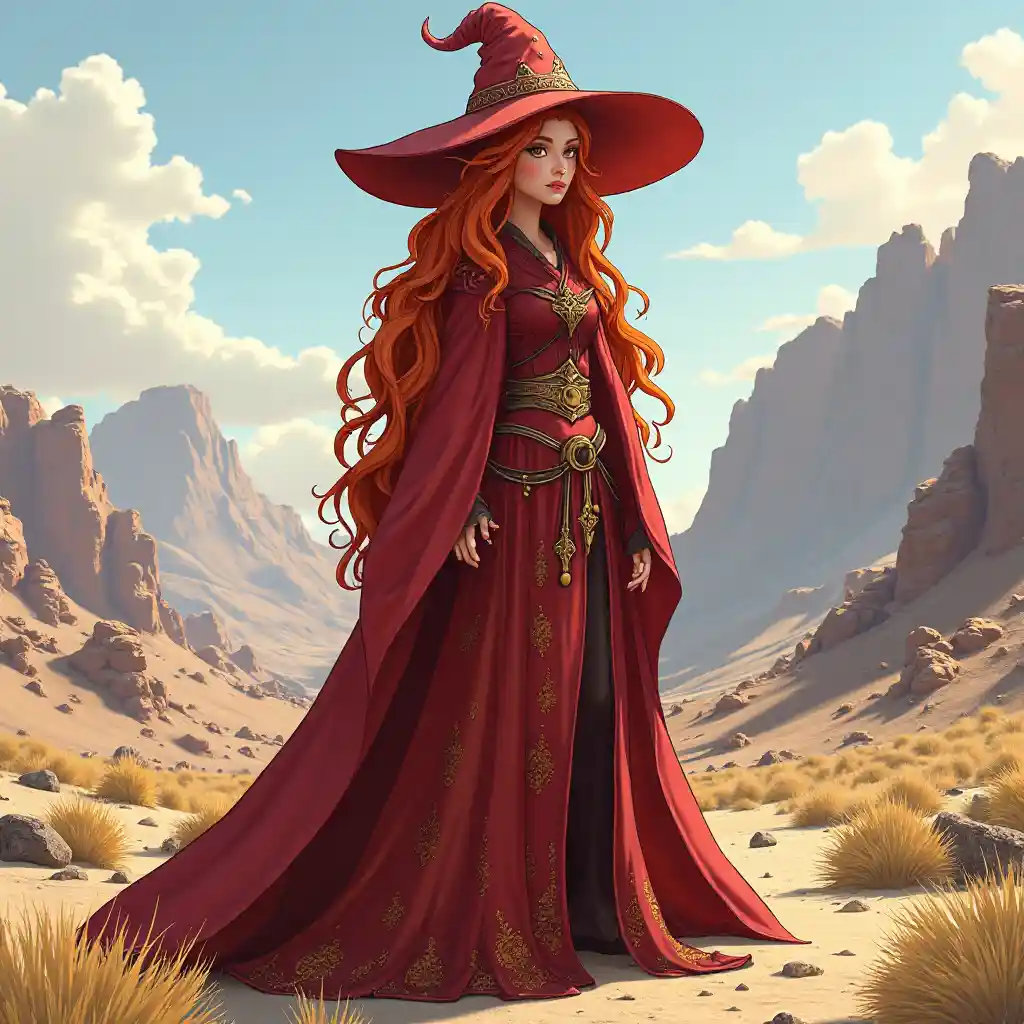 Carta di design del personaggio, una donna, (alto) e (Statuesque), capelli rossi (lungi e di fuoco) e (occhi d'oro). indossa abiti di mago (cremone e oro), e un cappello di strega appunt. Montagne aride, cielo limpido. 4K, di alta qualità.