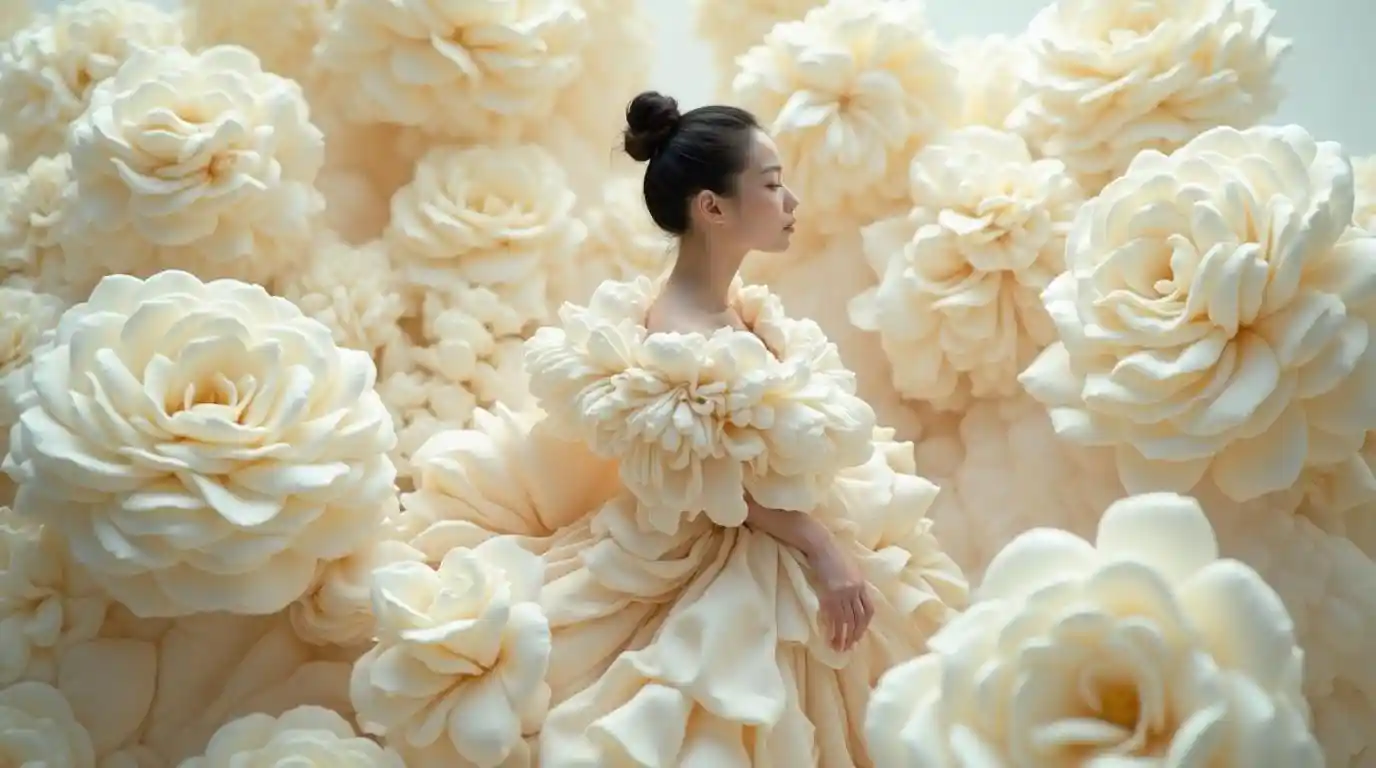 Generate un'immagine con una modella cinese immersa in un opulento mare di grandi, morbide e voluminose texture floreali. È vestita con uno splendido abito fatto interamente di strati su strati di delicato tessuto a ciocche che imita l'aspetto di fiori o petali simili a nuvole. Il tessuto è leggero ed aria, creando un effetto tridimensionale che la avvolge in un bozzolo di biancheria e creme. Il design del vestito è sia all'avanguardia che etereo, con ogni volano e piegatura meticolosamente realizzati per assomigliare a formazioni floreali naturali, fondendo i confini tra moda e natura. L'atmosfera è di serena eleganza e bellezza da sogno, con le trame del vestito in perfetta armonia con l'ambiente floreale circostante
