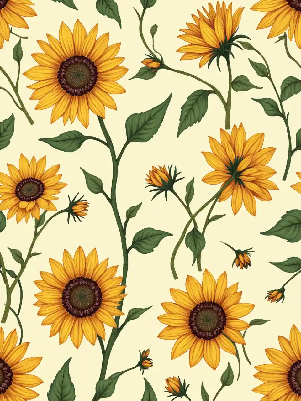Un disegno floreale senza cuciture che mostra i fiori di sole con petali gialli vivaci, un centro di semi marroni profondi e rigogli foglie verdi. I fiori sono disposti in modo naturale e piacevole, con gambi intrecciati. Alcuni girasoli appaiono in piena fioritura mentre altri sono in fase di germogliamento. Lo sfondo è morbido e neutrale per mantenere una sensazione elegante e senza tempo. Il design vettoriale è nitido, ad alta risoluzione e ottimizzato per varie applicazioni tessili e digitali