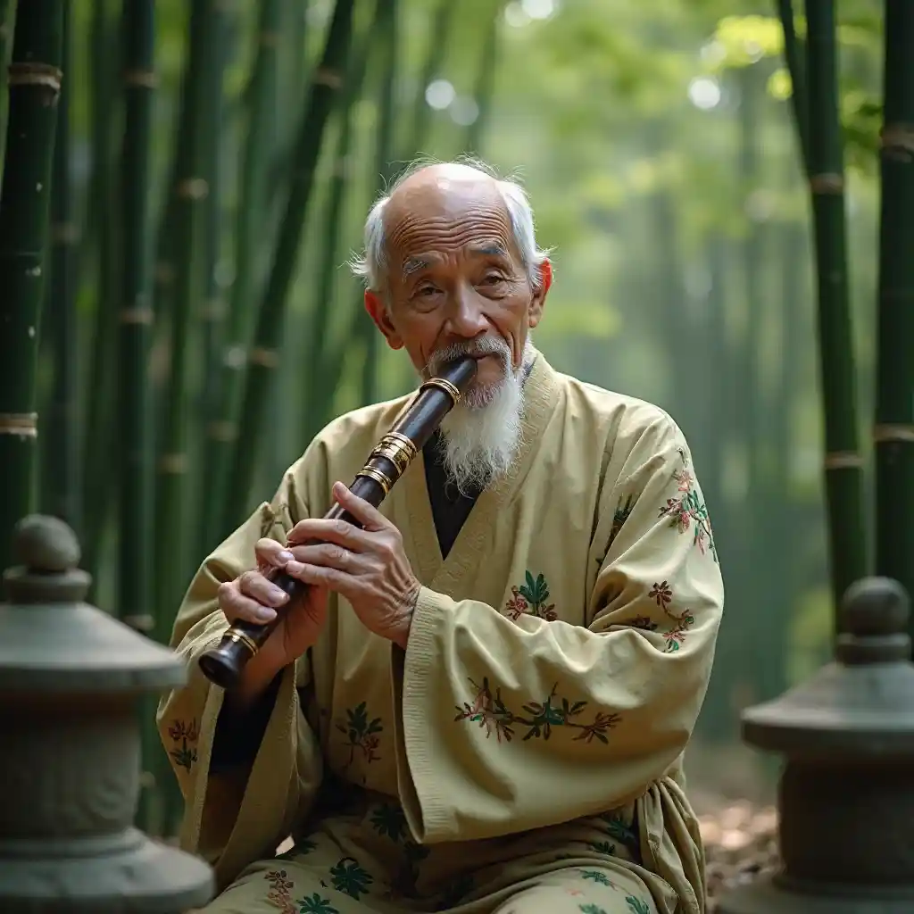 Suonando il flauto in una foresta di bambù, un uomo dell'Asia orientale di 82 anni con la barba bianca indossa una veste ricamata con foglie. Lanterne di pietra e uccelli che cantano lo inquadrano, le sue note emozionanti irradiano tranquillità e profondità culturale in un ambiente sereno e naturale. La sua musica scorre come il vento.