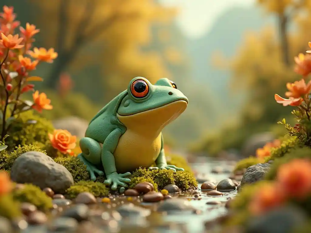 Una mini bambola rana antropomorfica è posta in un piccolo paesaggio diorama. I colori caldi e brillanti della stanza creano un mondo in miniatura che è stato auto