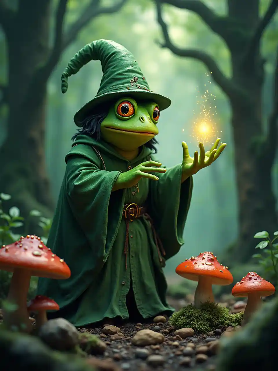 Un mago rana verde indossa una vestaglia da mago, e lancia un incantesimo su alcuni funghi in una fitta foresta
