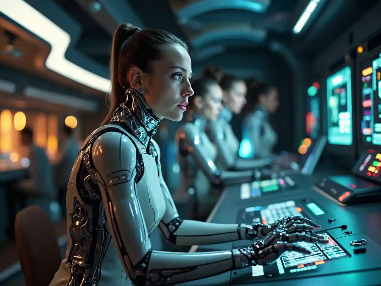 La telecamera traccia una donna cyborg futuristica con una pelle metallica e circuiti luminescenti. Lavora nel centro di comando ad alta tecnologia di un veicolo spaziale. Manipola i pannelli dei fulmini. Finendo il video con uno zoom, una foto larga della stanza per mostrare altri Cyborg che lavorano sui pannelli. L'illuminazione a contrasto sottolinea l'atmosfera di fantascienza. cinematografico, colorato, colori vivaci, alto contrasto, alta risoluzione, studio professionale, ora d'oro, fotorealistico, iperrealistico, illuminazione volumetrica, alto contrasto, alta risoluzione, studio professionale, ora d'oro, fotorealistico, iperrealistico iper dettagliato, 4K, stile realismo magico