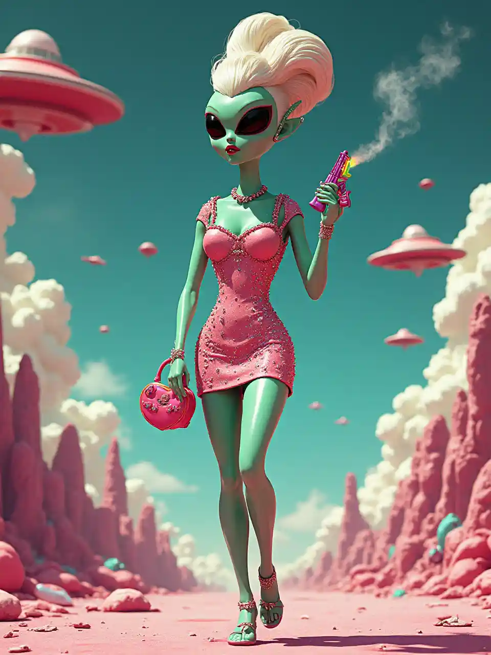 A super hyper-stylized alien babe with mint-green skin, a large conical head, and huge glossy solid black almond-shaped eyes struts down a chrome-pink asteroid catwalk like she owns the cosmos. Her proportions are wildly exaggerated—tiny waist, long legs, and a towering 1960s-style bouffant in high-gloss bubblegum pink, studded with glittering crystal barrettes. She wears a skintight holofractal minidress in classic mod style: sweetheart neckline, cinched waist, and bold chrome seams that catch the starlight. One hand holds a tiny holographic purse shaped like a heart; the other brandishes a pastel raygun still trailing rainbow smoke, held like a cigarette. Her lips curl into a smug little smirk, lashes exaggerated into cartoon curves. She glows with brat energy—totally glamorous and ready to vaporize your self-esteem. Around her, retro billboards glitch in and out with ads for “Intergalactic Glitter Gloss,” UFOs cruise like vintage cars, and spiraling moiré portals flicker in the sky. Everything pops in saturated teal, chrome pink, and holographic rainbow, with soft analog grain and high-gloss cartoon glam. Style: retro pop / retrofuturistic cute. Proportions: fashion doll. Finish: shiny, grainy, glossy, hyper-colorful. Vibe: vintage Barbie meets B-movie alien overlord meets sass queen.