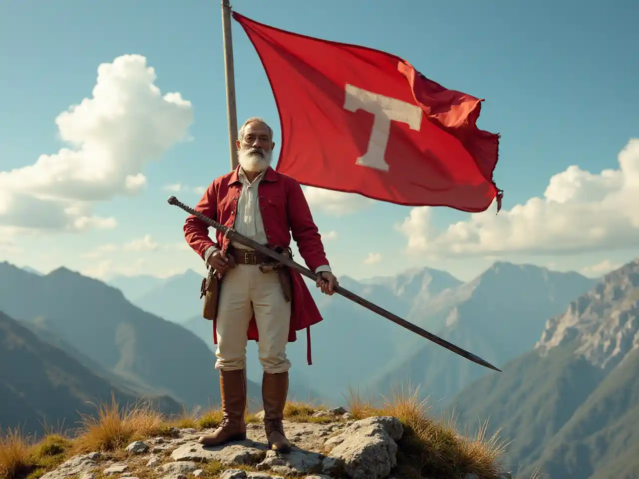 Giuseppe Garibaldi, vecchio, con la camicia rossa del XVIII secolo, i pantaloni bianchi, in piedi su una montagna con una bandiera e una grande spada