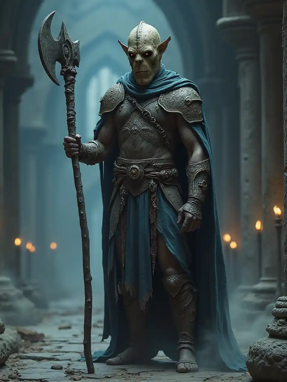Un guerriero magro con un'armatura cerimoniale incisa con antiche rune, la metà del suo volto è nascosto da una maschera di legno a. I suoi occhi brillano debolmente. Porta una scuderia a forma di bastone, vuota e suona debolmente al vento. L'ambientazione è una cattedrale sterile di pietra e ossa, illuminata solo da fantasmiche lanterne blu. La sua armatura sembra sia sacra che profanata, avvolta da vesti sbiadite. La nebbia si arricchisce intorno ai suoi piedi. Umore oscuro e solenne.