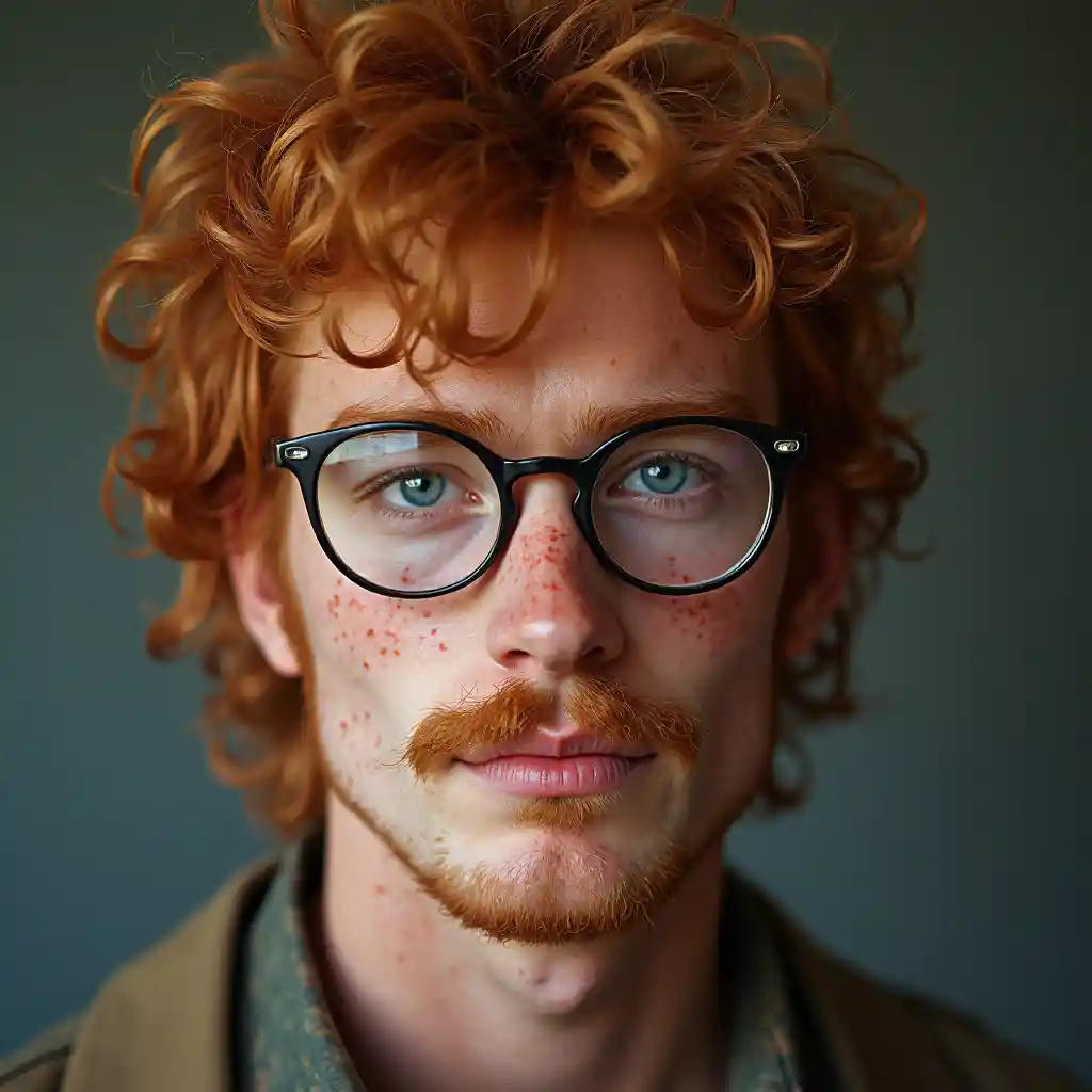 Graysonmaschio rosso con baffi da cowboy e occhiali 20 anni occhi bianchi blu e lenti, forte fascia, moda anni '80