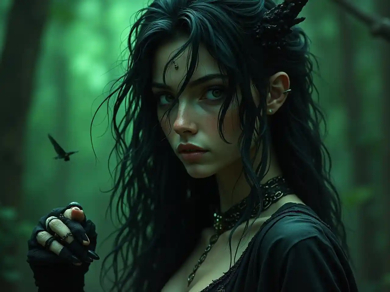 BellaSfondo nero e verde con una ragazza guerriera e uno spirito nero sullo sfondo con una ragazza metà nero unghie e gli occhi e la metà verde