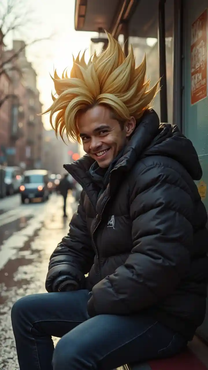 indossando Gr!llz, Goku da Dragonball Z come un super saiyan, grande sorriso, ultra realistico, IMG_1018.CR2, seduto in una fermata dell'autobus, alcuni obiettivi di luce solare sullo sfondo. stile casual, indossando un cappotto scuro, guardando direttamente allo spettatore, un giorno di pioggia a New York, autunno, la luce del sole filtra attraverso