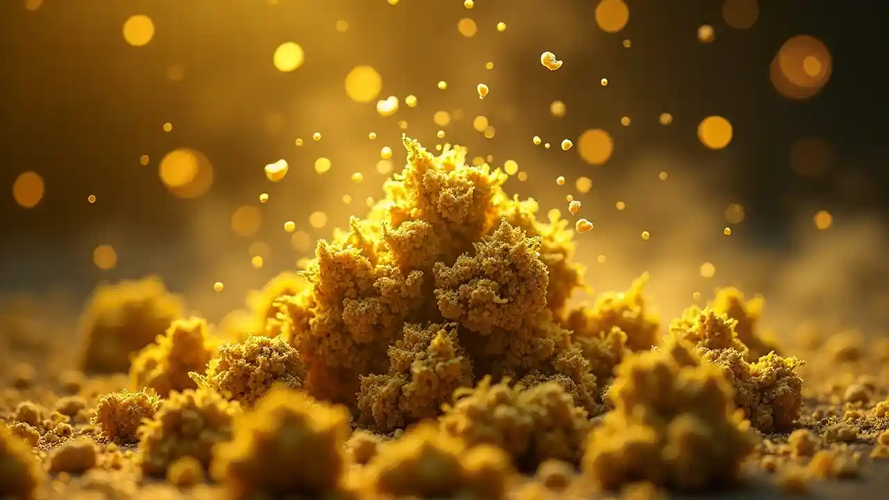 Resina viva concentrata, esplosa, foglie d'erba dorata, galleggiante, fumante, 4K, foto-reale
