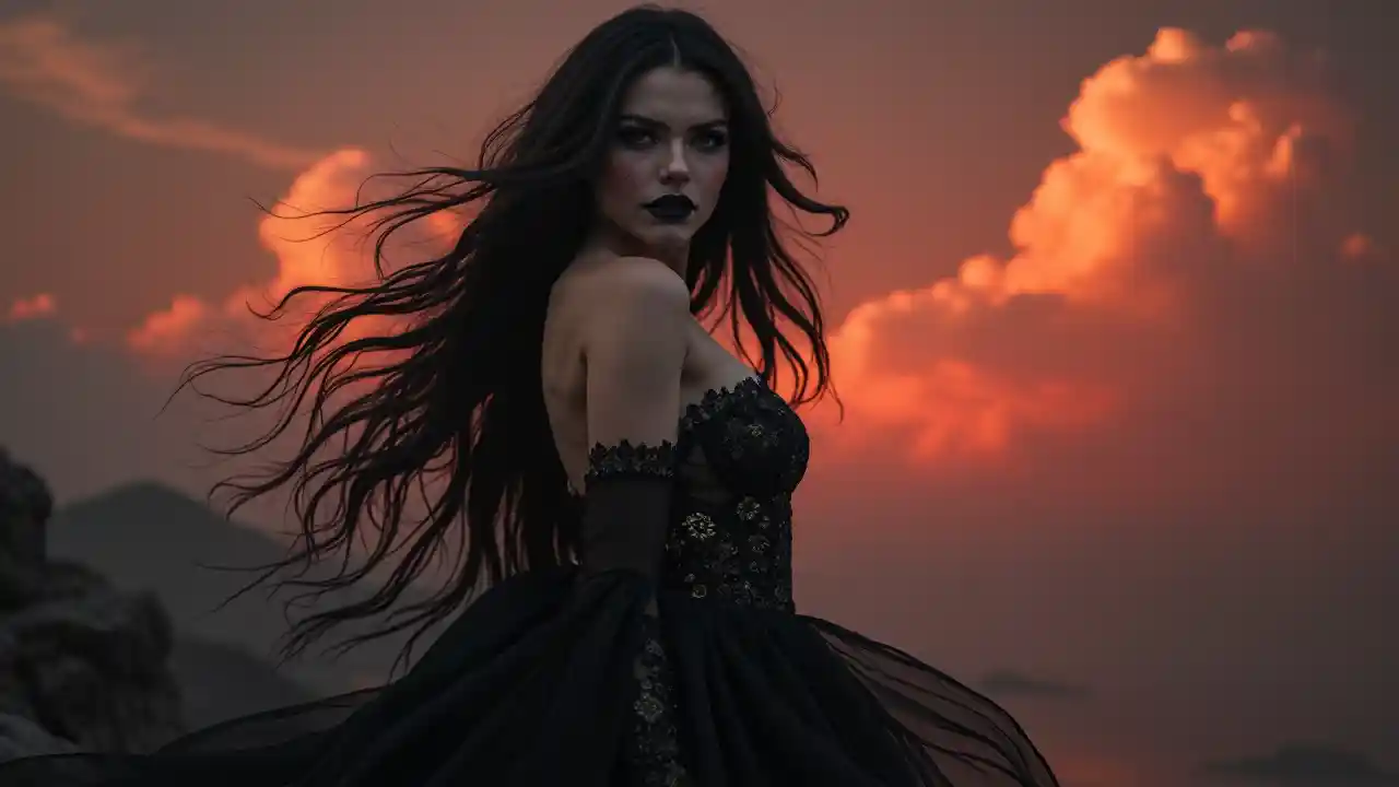creare (((ultra-reale, ultra- dettagliato, alta definizione))) foto del corpo completo di (((belle, donna dalla pelle chiara, corpo femminile grasso))), fluente (((capelli neri ondati))) con (((cos'è il trucco gotico, mascara gocciolante, colore delle labbra nere))), incarnando un misto capriccioso e sofisticato di feroce e misteri. Il suo abito gotico nero. È l'incarnazione del fantasma del corvo, si alza sulla scogliera di gomma con fiducia. I cieli sono illuminati da nuvole di nero come sfondo.