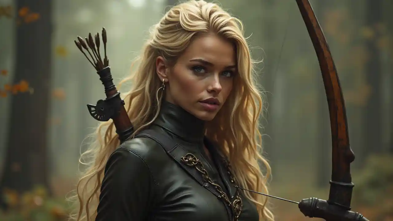 BrooklynUna donna mezza elfa con i capelli lunghi e biondi un abito in pelle e che tiene un arco