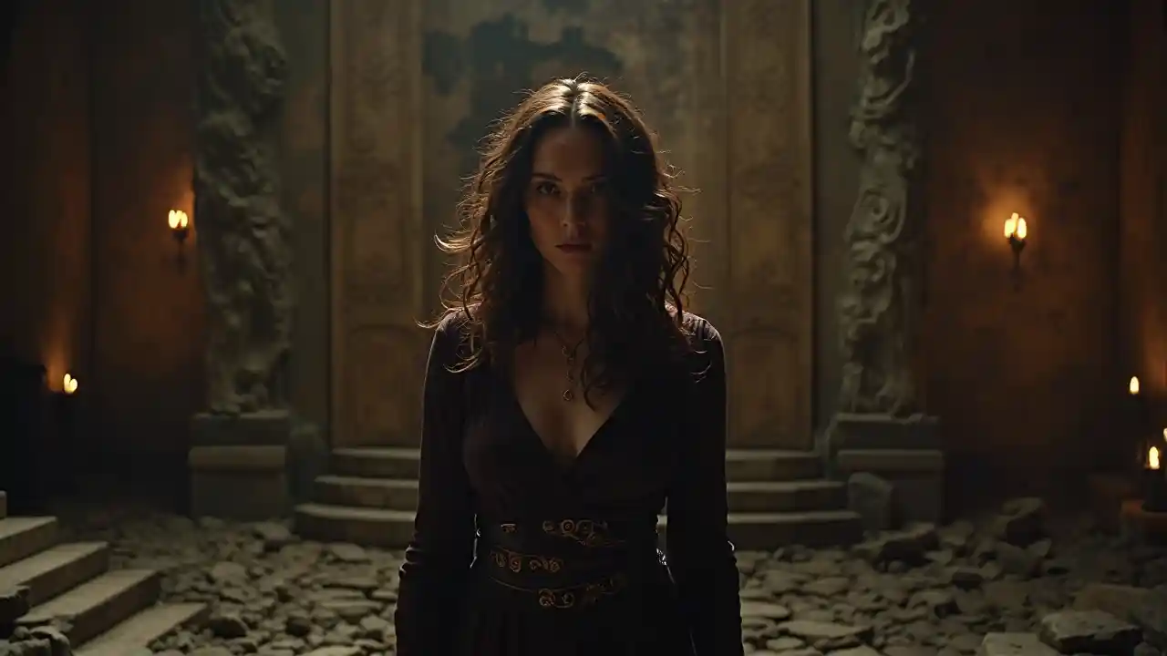 Di Neil Gaiman e Guillermo del Toro, visualizza Rachel Weisz come una veggente mistica, che svela profezie di un altro mondo in un tempio antico e infestato la notte di Halloween, inquietante, mistica, Halloween, fotografia cinematografica, scatto d'azione, movimento, epico, alta definizione