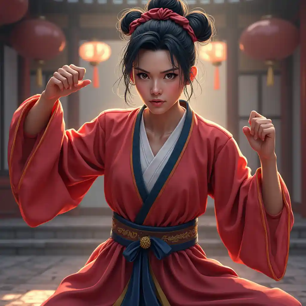 Han Juri di Street Fighter. Posizione da combattente, duro, sfondo in stile coreano, tema coreano, hanbok colorato, maniche lunghe capolavoro, alta qualità, luce morbida, texture naturali della pelle, luce ambiente calda e accogliente, ombra realistica, ombre morbide, gradi lisci, composizione forte, sensazione cinematografica, aspetto crudo ma naturale, sfw
