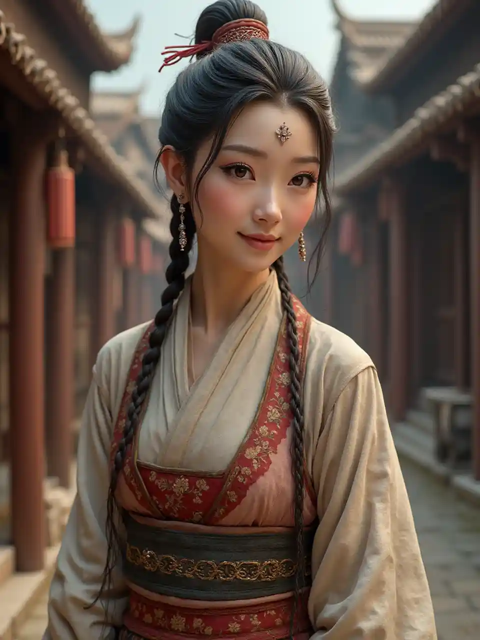 C'è una donna Han di 40 anni in piedi in un mercato nella Cina classica della dinastia Song intorno al 1050 dC. È vestita con abiti classici della dinastia Song. Ha i capelli della dinastia Song, gli occhi castani, un naso piccolo e una bocca piena e la dinastia Song. Indossa gioielli per il viso e il corpo della dinastia Song.