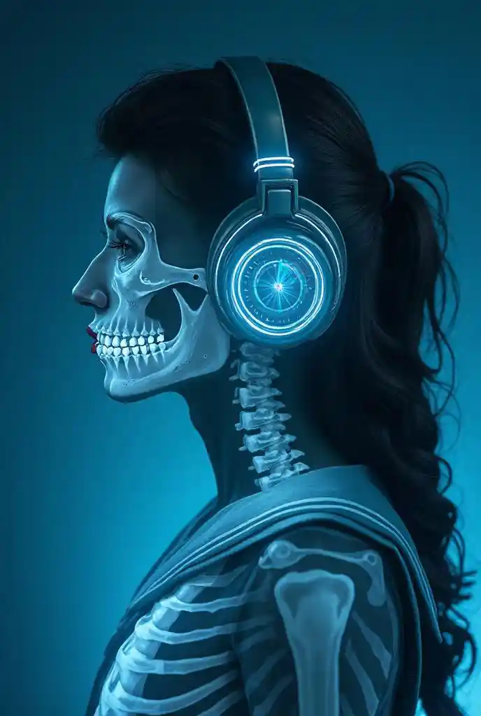 CalebWEARING BIG HEADPHONES :1.21, Precise radiography of a young woman:1.21, Skeleton specimen, wave hair on one side, sailor suits, blue background,