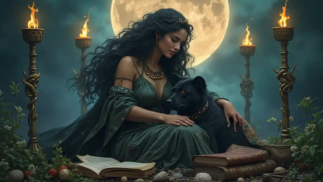 In un contesto mistico e illuminato dalla luna, raffiguri la benevola dea greca Ecate, circondata da simboli del suo vasto dominio. Mostratela come una figura maestosa e compassionevole, vestita con abiti fluenti e ricamati con stelle, con un'espressione dolce e nutritiva, con un tono di pelle che irradia un'illuminazione lunare. I suoi capelli ricci e lunghi scendono per la schiena come una cascata di velluto. Culla il suo fedele e elegante cane nero nel braccio sinistro, mentre la mano destra accarezza dolcemente il pelo morbido di un gatto curioso, la sua forma mute siede accanto a lei. Due torce, intrecciate tra loro da serpenti, si alzano dietro di lei, proiettando una luce calda ed eterica sullo scenario. Ai suoi piedi giace una collezione di antichi volumi rivestiti di pelle, ornati di intricati simboli mistici e di varie erbe esotiche e piante velenose, che mostrano la sua vasta conoscenza. Sullo sfondo, sottili nuvole di nebbia evoca il regno degli spiriti, con sussurri di figure fantasmiche, allusi al suo potere sull'oltretomba e la magia.