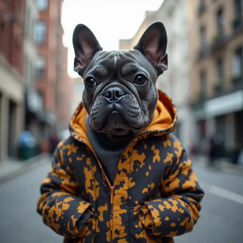 JacobUn bulldog francese grigio in abiti hip hop in una città