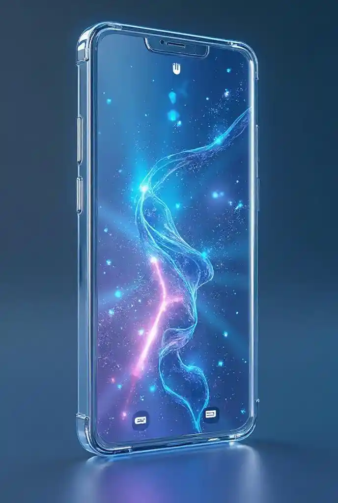 Uno smartphone traslucido futuristico con un corpo ultra elegante e simile a un vetro. Il dispositivo dispone di uno schermo OLED completamente trasparente che visualizza icone di applicazioni olografiche e di un'altra