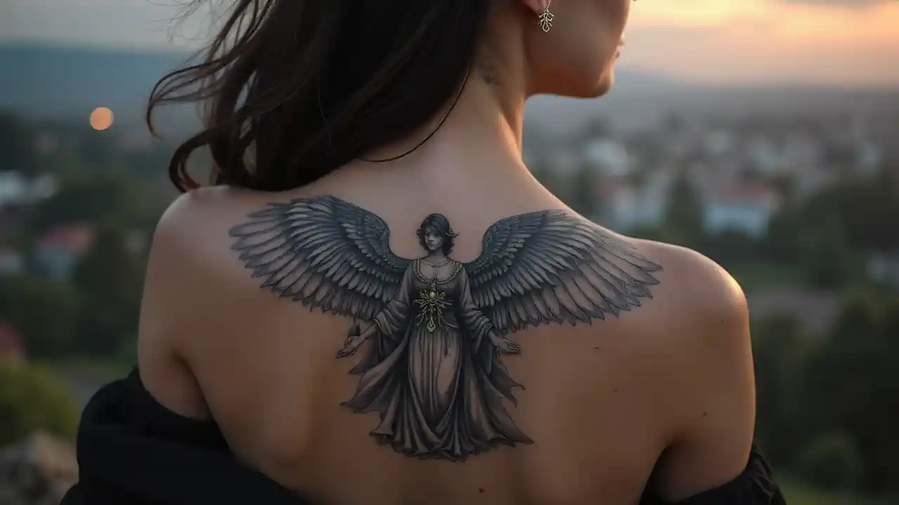 Un incredibile tatuaggio di un angelo sulla schiena di una bella donna