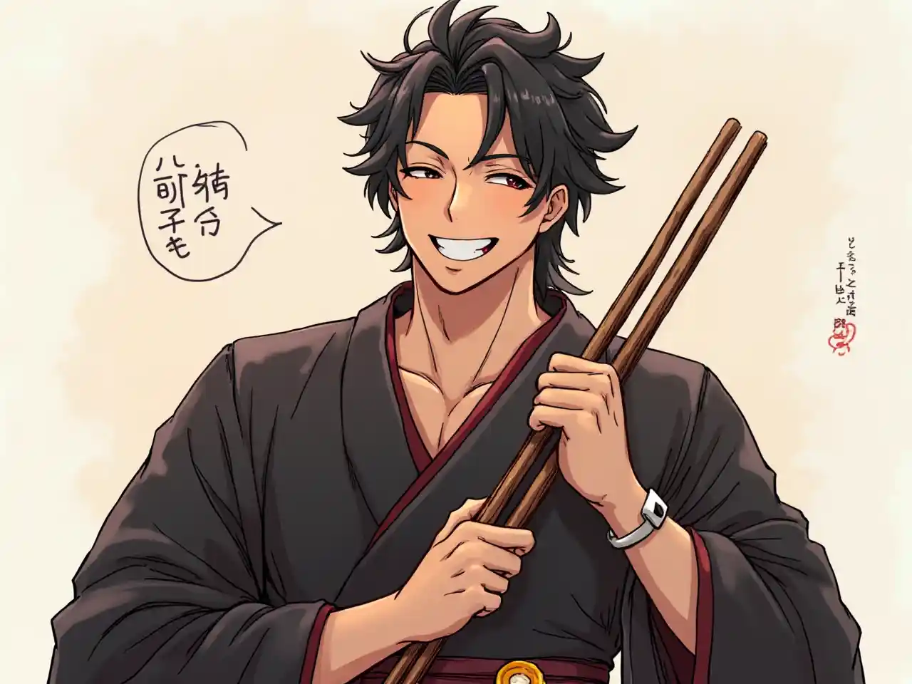 OliverPersonaggio giapponese, maschile giovane, sorridente, di corpo intero, con kimono nero, faixa vermelha na cabeça, segurando una bande