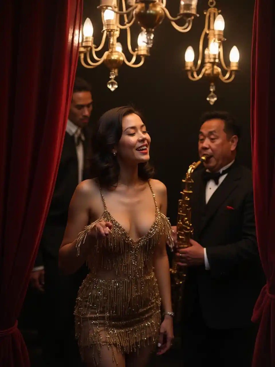 Cantando in una sala jazz sotto lampadari in stile art déco, una donna asiatica sui 35 anni cattura con un vestito a frange e a farfalla. Le tende di velluto e un sassofonista la incorniciano, la sua voce soffiante di un fascino senza tempo.