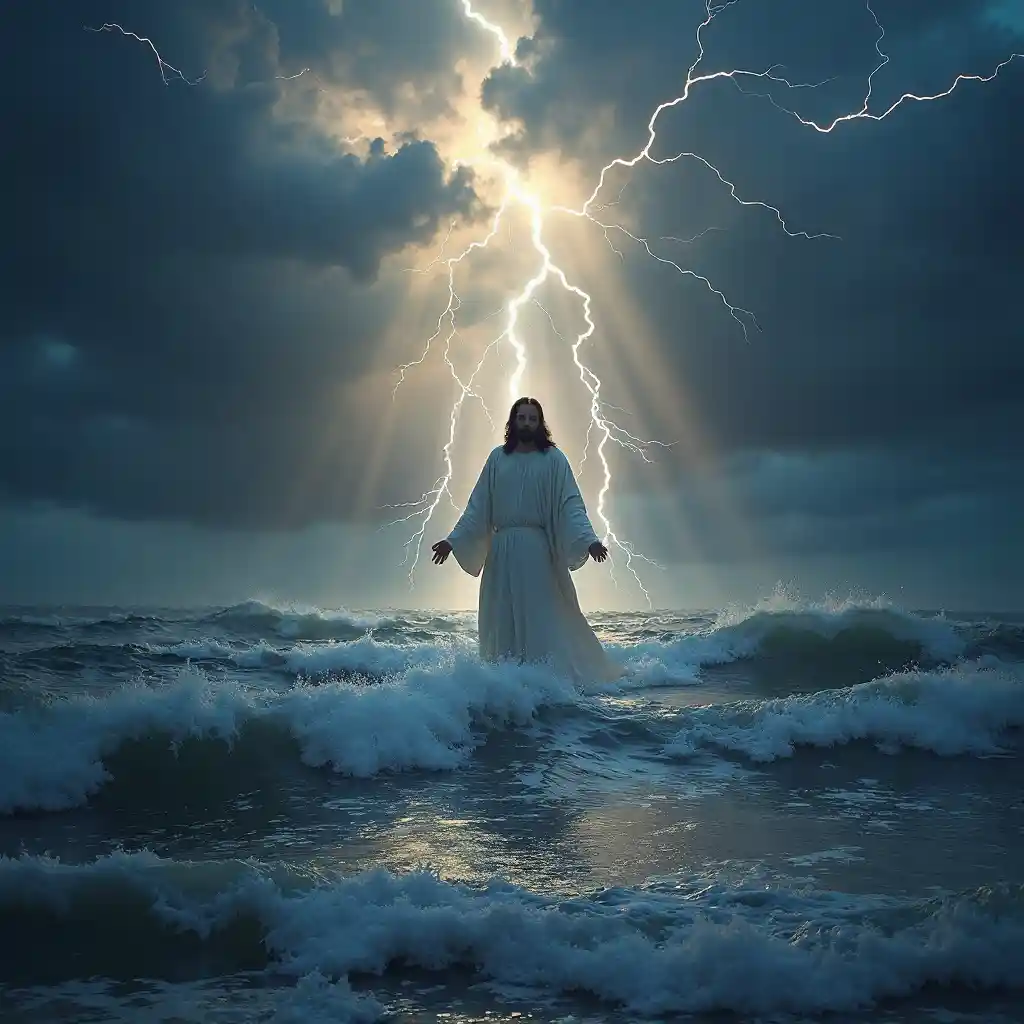 Gesù è vestito e all'orizzonte come una figura a un miglio di distanza e cammina sull'acqua in una tempesta circondata da fulmini e tuoni. Egli è trasfigurato in una luce spaventosa. Le onde si stanno scontrando con la costa in primo piano. Il volto di Gesù e' perfettamente formato e calmo ed inciso nella luce. La tempesta è viva e forte. Il cielo scuro ed enigmatico con onde di fulmine iridescenti.