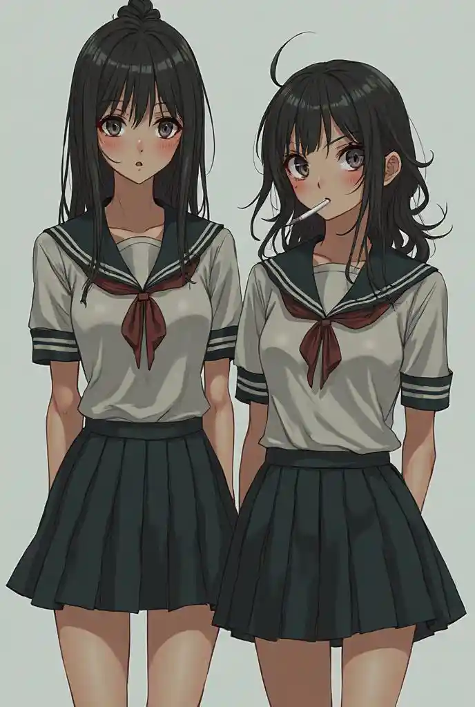 VictoriaDue alte e sexy ragazze giapponesi con una sigaretta in bocca, vestite in uniforme di liceo JK con gonne molto corte, un bel viso con uno sguardo laterale