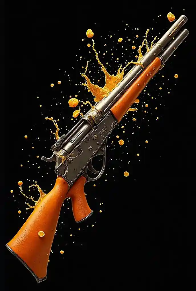 JosephImmagine digitale. Gievoli di acqua e spruzzi di succo d'arancia. Un'arma Makarov dettagliata. Pistola con (costruzione di buccia di arancione)) e fette di arancione.Fondo nero. Dettagliato,