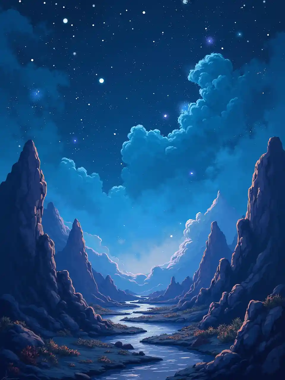Progetta una copertina di un libro di fantasia nello stile di Kelly Ritchie usando l'illustrazione digitale. Ispiratevi agli sfondi minimi ma accattivanti di Kelly Ritchie. Create una scena con un cielo notturno affascinante pieno di nebulose e di distanti costellazioni. Aggiungete motivi incantevoli come cristalli luminosi e antiche rovine sparse per il paesaggio. Temperatura del colore: blu e viola profondi, che evocano un senso di mistero e di magia. Illuminazione: la luce della luna proietta sottili evidenze sulle stelle e sui motivi. Atmosfera: Incantevole e di un altro mondo, attirando gli spettatori in un regno di fantasia. --v 5 --stilizzare 1000