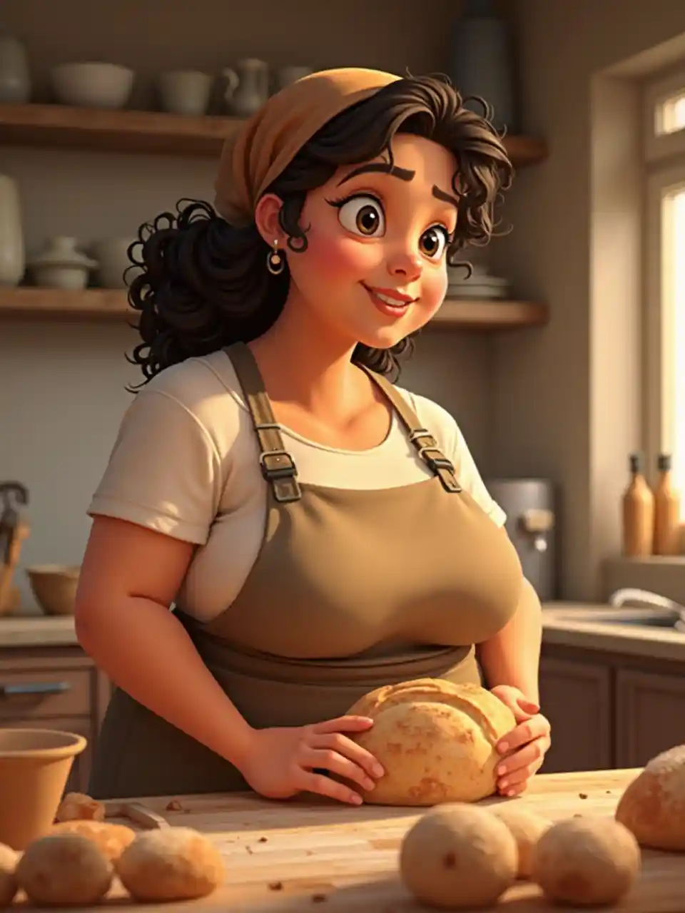 ruslanaDonna bionda sudamericana, grassa, labbra piene, capelli ricci, marroni, indossa un grembiule, velo in cucina, davanti a un bancone, impastando un pezzo di pane, stile Disney