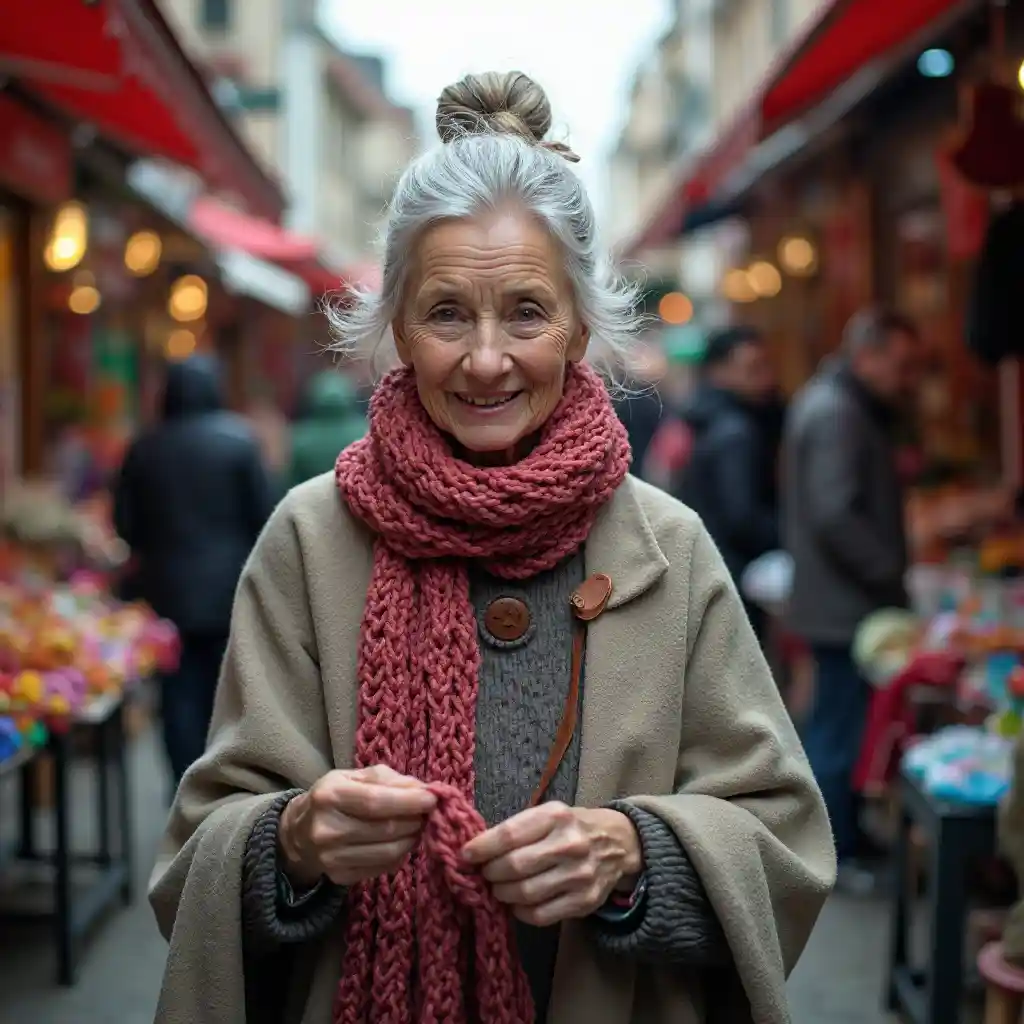 Una donna bianca di 79 anni con un panino indossa un mantello con un nastro. Stalle colorate e venditori la incorniciano, i suoi aguzzi agili irradiano abilità e affascinante fascino in una viva scena urbana. I suoi occhi caldi invitano alla conversazione.