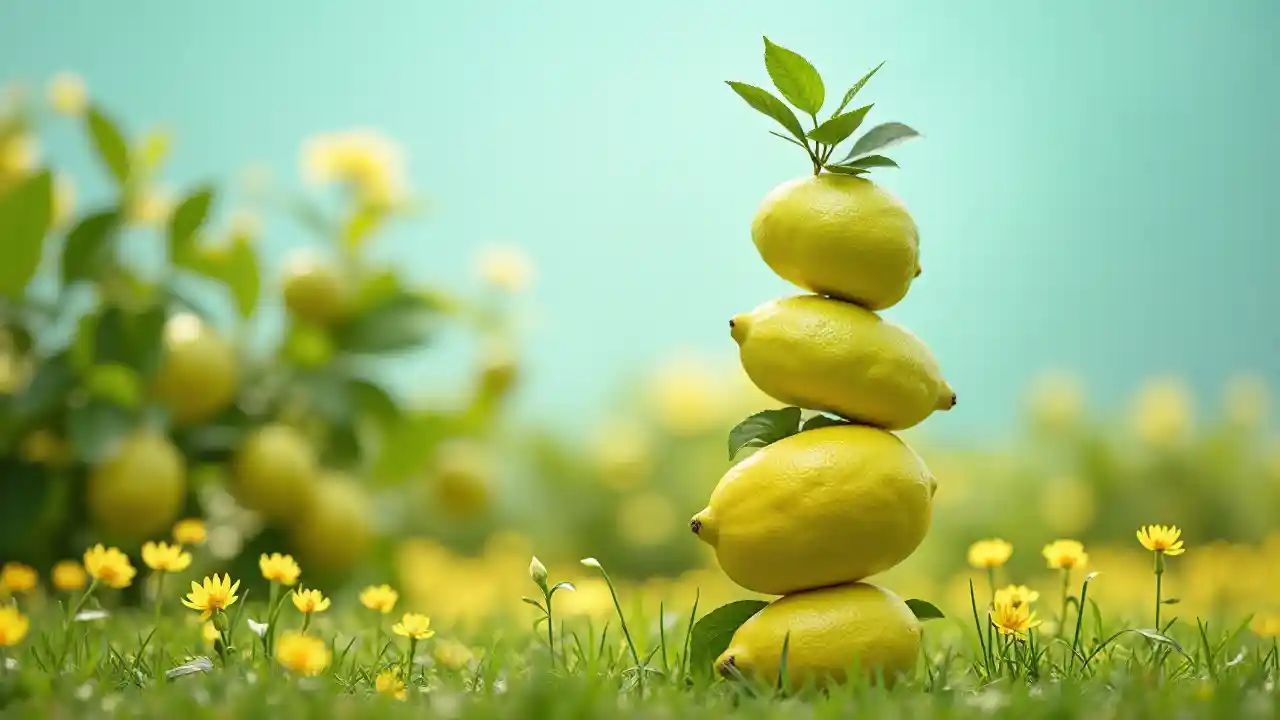 diversi limoni verdi impilati formando una bottiglia di acqua minimalista con alcune foglie intorno, bellissima piantagione di limoni sullo sfondo e cielo blu, erba corta e fiore giallo + fiori gialli + luce ambientale + bei colori