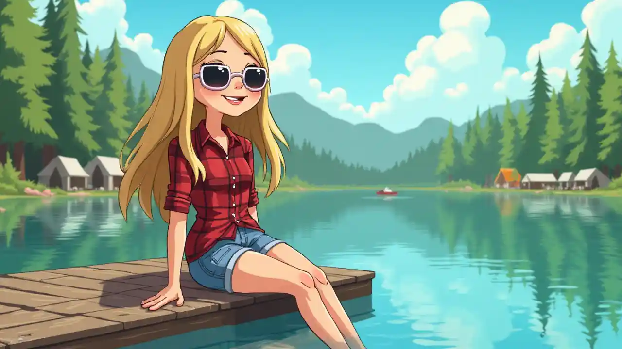 Digital painting of 21-year-old Leni Loud in a blended cartoon art style reminiscent of The Loud House and Total Drama. She is sitting on the edge of a rustic wooden dock that extends out into a calm lake, with her feet dangling in the cool water. She's wearing a red plaid shirt tied at her lower waist, rolled-up sleeves, and denim short shorts. Her signature long, straight blonde hair with a subtle wave falls around her shoulders, and she's wearing her iconic sunglasses. The background shows a serene lake reflecting lush green trees and a clear, light blue sky with scattered fluffy white clouds. The campground with tents and tall pine trees is visible in the distance. Leni has a relaxed and cheerful expression. The lighting is soft and natural, suggesting a pleasant day outdoors. Subtle shading defines the forms and textures. Full body shot.