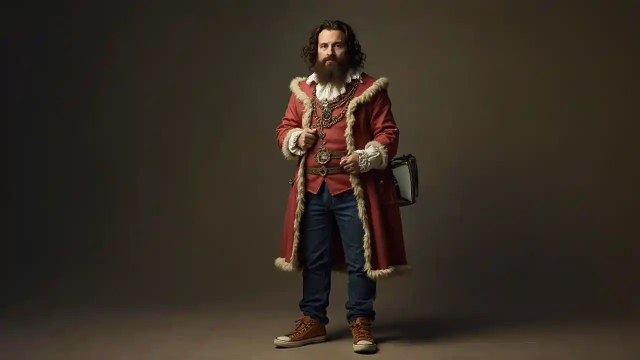 Luigi XIV vestito con jeans e scarpe da ginnastica.