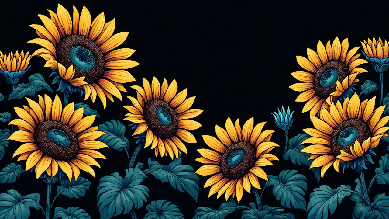 (sfondo nero)), (manga, romanzo grafico, vettore duro) girasoli blu e dorati