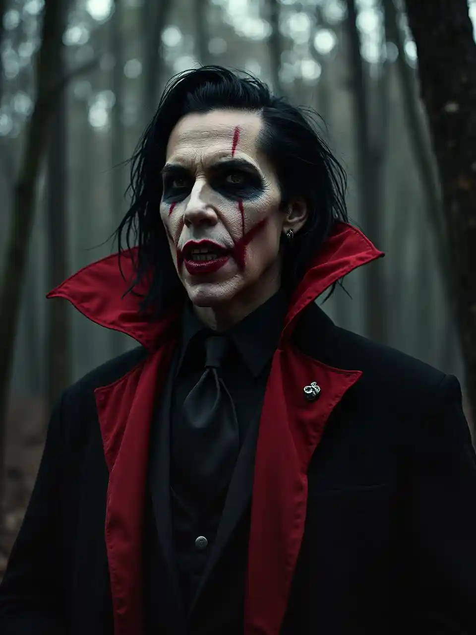 Marilyn Manson in costume di Dracula per Halloween, trucco da paura, atmosfera scura, stile vintage, colori rossi e neri, foto ad alto dettaglio, foto professionali, sullo sfondo di una vecchia foresta scura, luce contrastante, colori brillanti, atmosfera scura