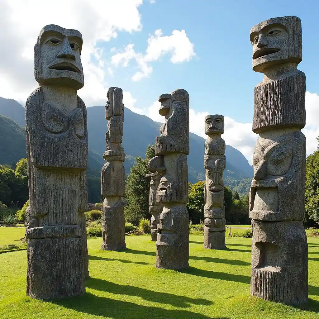 Marae maori (luoghi di riunione) con totem intricatamente scolpiti, sullo sfondo del rigoglioso paesaggio della Nuova Zelanda.