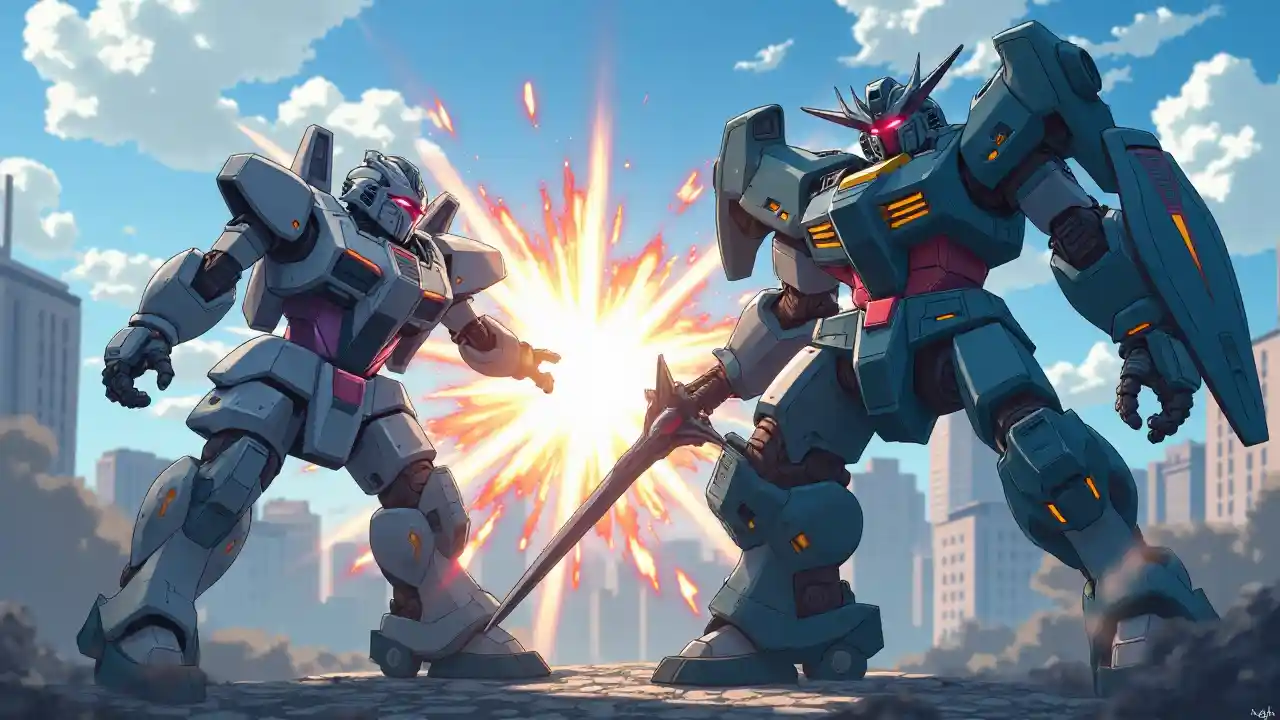 Fai una scena di anime di una battaglia tra due mech - robot umanoidi di 10 metri - contro un paesaggio urbano. I due robot si trovano faccia. Un robot spara una raffica di missili, creando un'esplosione drammatica, e il meccanico colpito dai missili cade. Gli occhi del robot caduto brillano di rosso, e si alza, tirando fuori una spada futuristica. Con un'animazione dinamica e veloce, si lancia contro il robot che ha sparato i missili, pronto per un'incontro epico.
