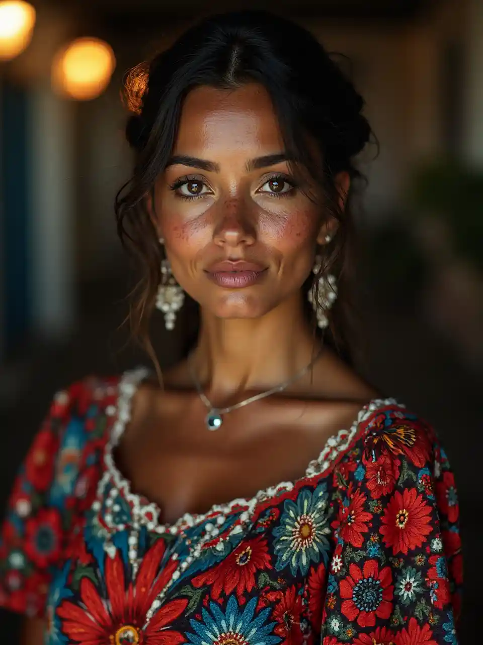 KinsleyUna bellissima donna messicana con le lenti, indossa un abito ricamato colorato e vibrante, a colpo pieno, di notte
