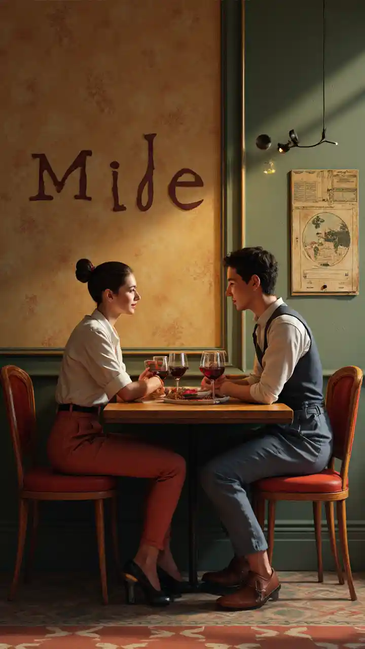 due uomini e due donne seduti a un tavolo con dei bicchieri di vino davanti a loro, con le parole Mileo sul muro, Art Nouveau, tendenza della stazione d'arte, un realismo fotografico 3D