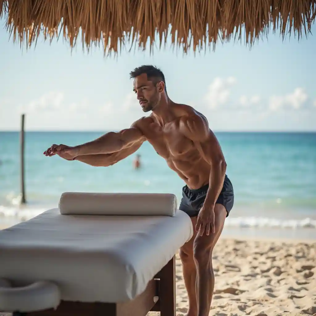 un uomo muscoloso con 4 braccia accanto a un tavolo da massaggio sulla spiaggia