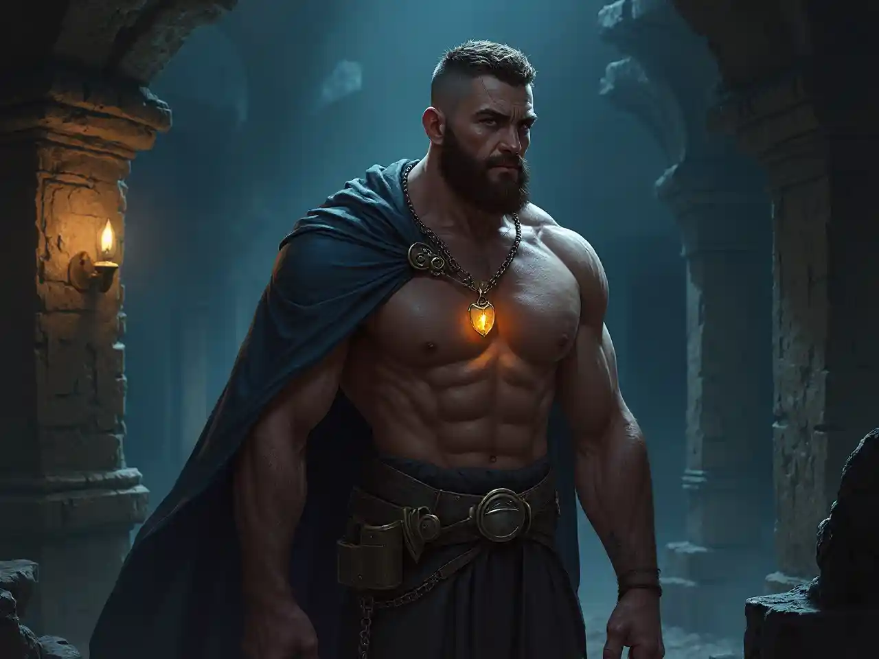 Uomo maschio massiccio con i capelli corti e la barba, dentro una prigione di notte, indossando una collana magica, pathfinder, setting d&d, in uno stile artistico digitale di alta qualità, migliorata qualità delle ombre